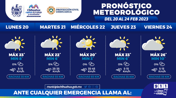 La Coordinación Municipal de Protección Civil, informa que, para la semana del 20 al 24 de febrero, se pronostican días cálidos, con mañanas y noches frías, además de fuertes rachas de viento para el martes 21 y miércoles, por lo que exhortan a seguir cuidándose para evitar afecciones a la salud por cambios bruscos de temperatura.