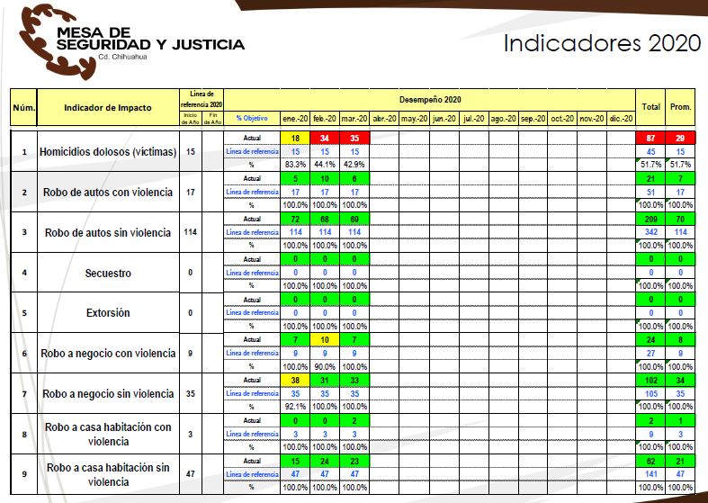 La Comisión de Indicadores de la Mesa de Seguridad y Justicia de la ciudad de Chihuahua dio a conocer la incidencia delictiva correspondiente a marzo de 2020; con base en la información generada por la Fiscalía General del Estado, con análisis del Observatorio Ciudadano de FICOSEC.