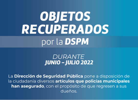 Con el objetivo entregar a sus dueños los artículos que han sido recuperados por policías municipales durante los patrullajes ordinarios o al realizar detenciones en calle, la Dirección de Seguridad Pública Municipal (DSPM) da a conocer el listado correspondiente, que a partir de esta fecha se encuentra pegado en las áreas de acceso al público de las Comandancias Norte y Sur, ubicadas en las avenidas Homero y Pacheco, respectivamente.