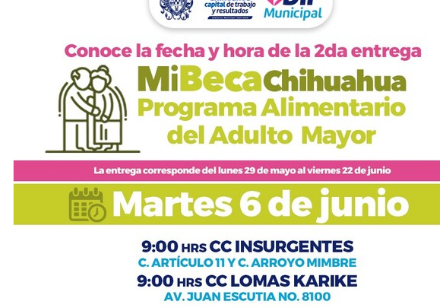 En atención al compromiso que el alcalde Marco Bonilla, tiene con las y los adultos mayores de Chihuahua Capital para garantizarles una mejor calidad de vida, el Gobierno Municipal, a través del DIF, informa a la ciudadanía los centros comunitarios y la hora en la que podrán acudir por su apoyo alimentario para mañana martes 6 de junio: