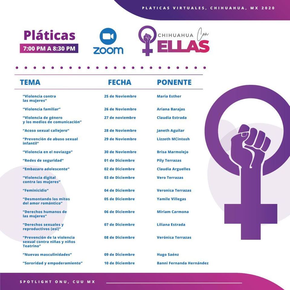 Las conferencias comenzaron el 25 de noviembre en el marco del Día Internacional de la Eliminación de la Violencia contra la Mujer y concluirán el 10 de diciembre, podrán ser vistas en la página de Facebook https://www.facebook.com/EllasCUU/, en un horario de las 19:00 horas a las 20:30.