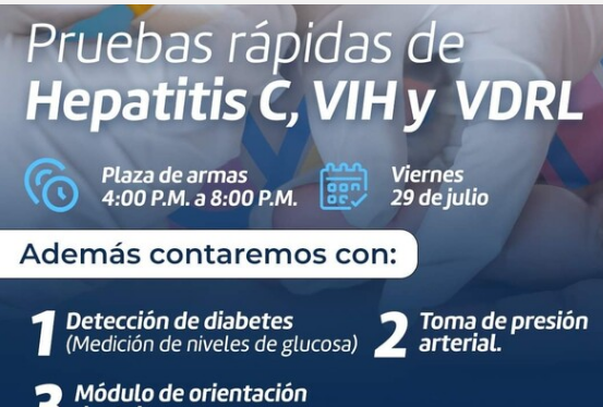 detección de Hepatitis C, VIH y sífilis; de manera complementaria se contará con la medición de niveles de glucosa para detección de diabetes, toma de presión arterial, así como un módulo en que se realizarán orientaciones de salud dental.