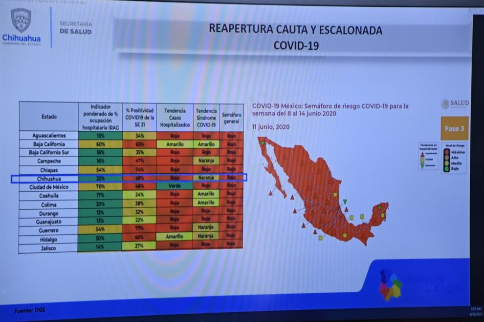 A su vez, el gobernador Javier Corral, informó que el Gobierno Federal les hizo llegar la propuesta de semaforización para Chihuahua, correspondiente a la semana del 15 al 21 de junio, en la cual se continuaría en semáforo rojo, o alerta máxima, ya que se estableció que si cualquiera de los elementos de medición se encuentra en rojo, el semáforo se considera del mismo color.