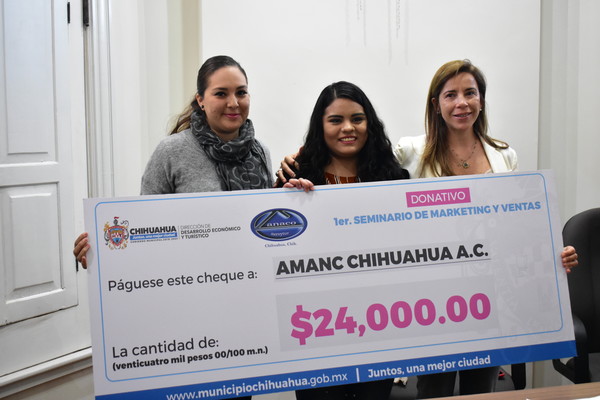 La entrega del cheque se realizó este viernes por parte de la directora de Desarrollo Económico y Turístico, María Angélica Granados Trespalacios, y Karen García Mimbela, en representación de CANACO Chihuahua, a Daniela Orona Muñoz, representante de AMANC.