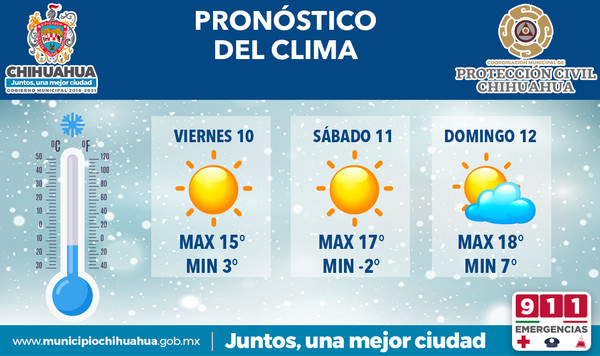 Respecto a la temperatura, se prevé que la máxima para los próximos 3 días sea de 18 grados centígrados para el próximo domingo y la mínima de -2 grados para el sábado, por ello es necesario seguir las recomendaciones preventivas y evitar con ello problemas de salud o hipotermias.