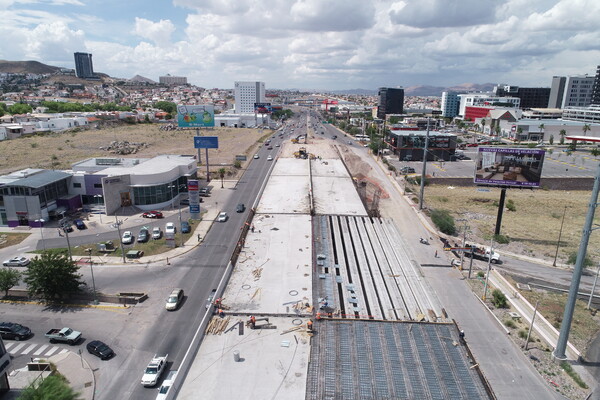 Actualmente se labora en la construcción de las dos últimas losas a base de acero y concreto hidráulico que formarán el paso superior sobre Periférico de la Juventud, además se sigue con los