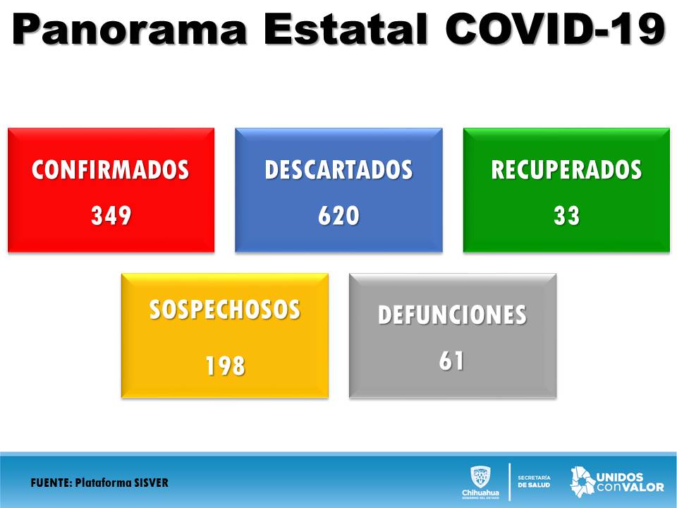 La Secretaría de Salud informó que de acuerdo al último reporte del avance del COVID-19 en el estado, Chihuahua registra 349 casos confirmados, 61 defunciones, 33 recuperados, 620 fueron descartados y 198 son sospechosos.