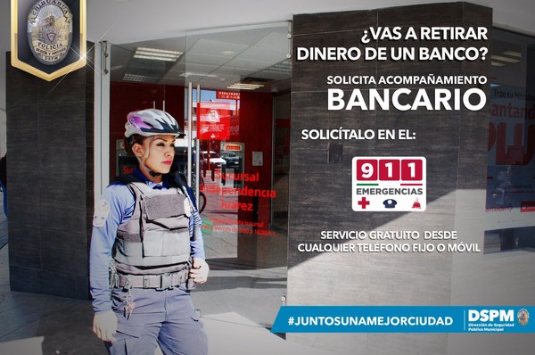 La Dirección de Seguridad Pública Municipal informa a los usuarios de instituciones bancarias, que sigue ofreciendo el acompañamiento de sus elementos para brindar seguridad al realizar movimientos bancarios con dinero en efectivo, para apoyarlos en el resguardo de su patrimonio.