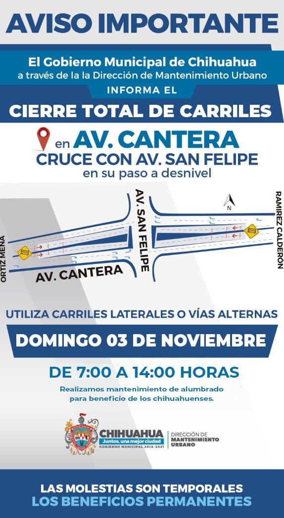 El Gobierno Municipal, a través de la Dirección de Mantenimiento Urbano, reitera el anuncio de tomar rutas alternas a la avenida Cantera en el paso a desnivel ubicado en la calle San Felipe, toda vez que el domingo 3 de noviembre permanecerá cerrado en un horario de 7:00 am a 2:00 pm.