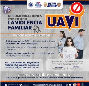 Chihuahua, Chih. A 28 de marzo de 2023.- Al ser la familia el eje principal de esta administración, como lo ha dicho el alcalde Marco Bonilla, la Dirección de Seguridad Pública Municipal (DSPM) pone a disposición de los ciudadanos las Unidades de Atención a la Violencia Familiar (UAVI) y emite recomendaciones para prevenir la violencia familiar o saber cómo actuar ante una situación de este tipo.
