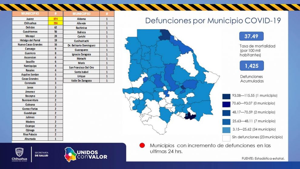 Que corresponden a 874 decesos en Ciudad Juárez, 286 a la ciudad de Chihuahua, 56 Cuauhtémoc, 2 a Guadalupe D. B., 6 a Ascensión, 9 en Camargo, 4 Rosales, 1 Bachíniva, 24 en Meoqui, 2 Buenaventura, 62 Delicias, 1 Ignacio Zaragoza, 1 San Francisco del Oro, 19 Parral, 2 Madera, 3 Coronado, 16 Nuevo Casas Grandes, 2 Ojinaga, 1 Valle de Zaragoza, 2 Bocoyna, 6 Saucillo, 1 Morís, 2 Gómez Farías, 3 Jiménez, 1 Urique, 3 Casas Grandes, 1 Allende, 3 Janos, 2 Galeana, 2 Ocampo, 3 Aquiles Serdán, 1 Balleza, 1 Matachí, 8 Guerrero, 4 Namiquipa, 2 Riva Palacio, 2 Julimes, 1 Guazapares, 1 Carichí, 1 Ahumada, 1 Cusihuiriachi, 1 Aldama, 1 Dr. Belisario Domínguez y 1 Santa Isabel