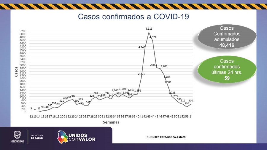 Secretaría de Salud, Wendy Ávila Coronado, informó que el último reporte epidemiológico confirmó que se tienen en el estado un total general de 48 mil 416 casos de COVID-19 con 59 nuevos registros, así como un acumulado de 4 mil 499 personas fallecidas, con dos defunciones registradas en las últimas 24 horas.