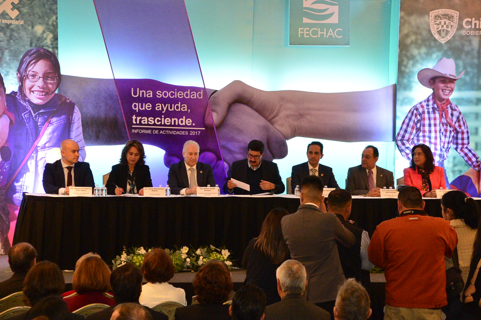 El Gobierno del Estado continuará apoyando modelos de colaboración y responsabilidad social compartida como el que desarrolla la Fundación del Empresariado Chihuahuense (Fechac), señaló el gobernador Javier Corral, durante su participación en el informe de actividades del comité directivo del organismo empresarial.