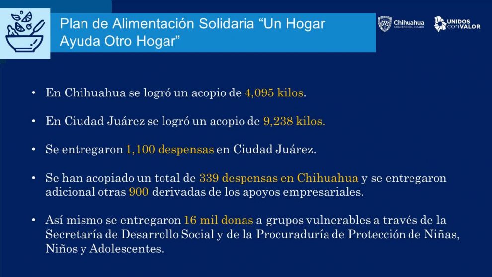Informó que las 20 toneladas de alimento han sido reunidas entre Chihuahua y Ciudad Juárez y se han integrado al proceso los Bancos de Alimentos, donde se encuentran trabajando en elaboración de las despensas con esos apoyos generosos de la sociedad civil.