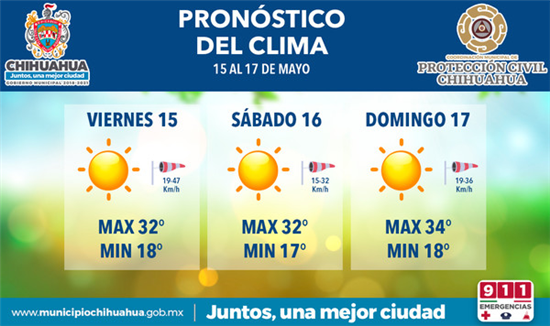 El domingo será el día más caluroso, con 34 grados como máxima y 18°C como mínimo, por cuya razón es sumamente importante protegerse y proteger a los pequeños y a las mascotas de la exposición prolongada al sol, tomar abundantes líquidos y continuar en casa, como lo han venido haciendo los chihuahuenses, debido a la pandemia del COVID-19, sobre todo en estos días en que se espera que la curva de contagios aumente rápidamente, informó Joel Estrada, titular de la dependencia.