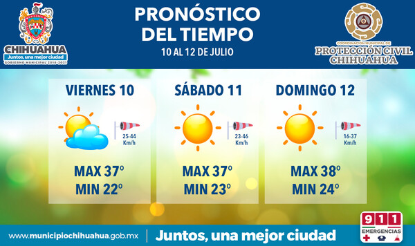 Para los días viernes y sábado la temperatura más alta será de 37 grados y la más baja de 22°C, con cielos mayormente soleados y vientos de 44 kilómetros por hora, en tanto para el