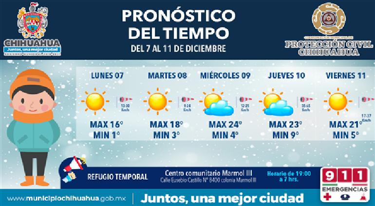 Joel Estrada Castillo, encargado del despacho de la dependencia municipal, exhortó a los chihuahuenses a protegerse de las bajas temperaturas que se están presentando en la capital y que pueden desencadenar en complicaciones respiratorias, si no se toman las precauciones necesarias. Al respecto, mencionó que el pasado fin de semana 43 personas recibieron apoyo en el refugio temporal de la colonia Mármol III, el cual permanecerá abierto de las 19 a las 07 horas para quienes lo requieran, el cual se atiende en coordinación con el DIF Municipal.