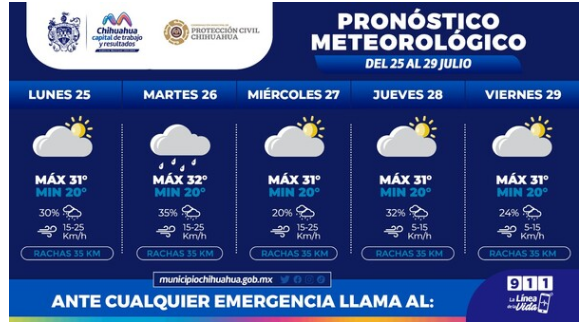 Por otro lado, para el día miércoles, la temperatura máxima será de 31°C y la mínima de 20°C y vientos de hasta 35 kilómetros por hora con cielo parcialmente nublado y un 20 por ciento de probabilidad de lluvia por la tarde, mientras que para el jueves se espera una máxima de 31°C y una mínima de 20°C y vientos de hasta 35 kilómetros con cielo parcialmente nublado y una probabilidad de lluvia de 32 por la tarde.