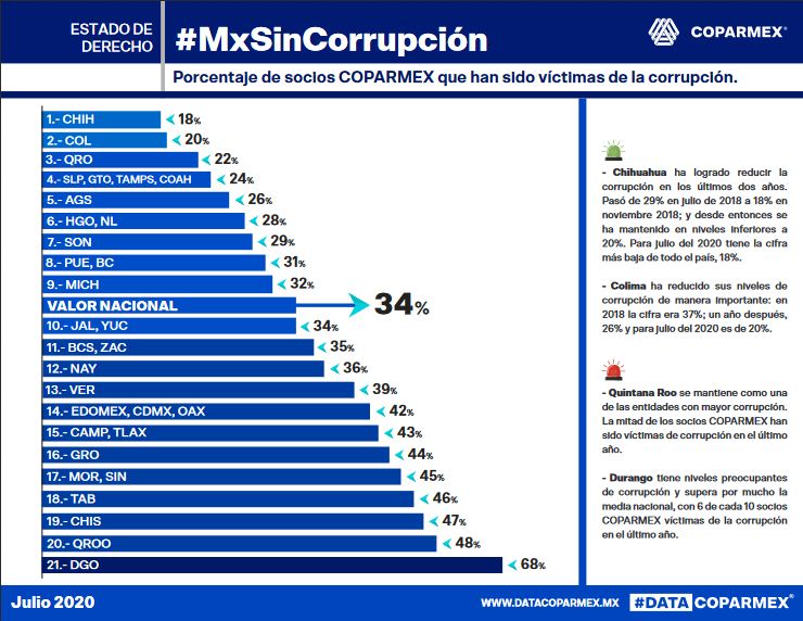 En el rubro de Estado de Derecho, el estudio arrojó que en el indicador, “Porcentaje de socios Coparmex que han sido víctimas de la corrupción”, solo el 18 por ciento de los empresarios encuestados dijo haber sido afectado, la cifra más baja del país.