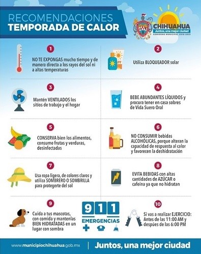 Héctor Tarango Cereceres coordinador municipal de Protección Civil, dio a conocer que de acuerdo con la Comisión Nacional del Agua la temporada de calor causará estragos este fin de semana, ya que para el sábado 8 de junio se esperan temperaturas máximas de 38 grados y mínimas de entre 20 y 21 grados Centígrados, con vientos de 40 kilómetros por hora.