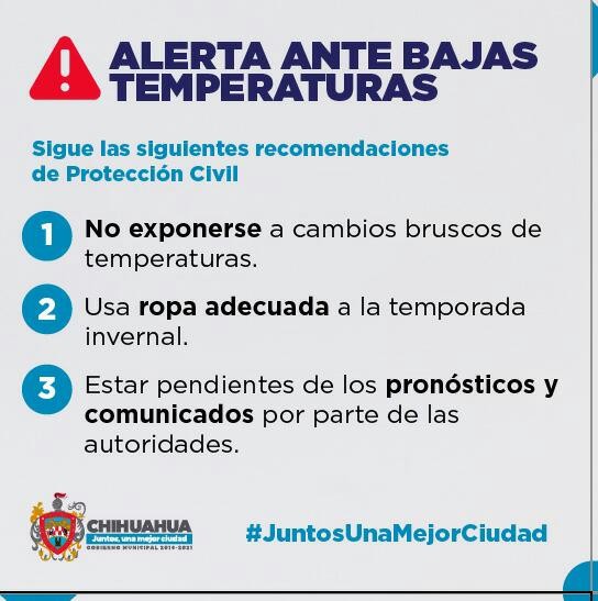 Con el fin de evitar incidentes ante las bajas temperaturas que se pronostican para este fin de semana, el Gobierno Municipal a través de la Coordinación de Protección Civil, hace un llamado a la ciudadanía para que tome las debidas precauciones.