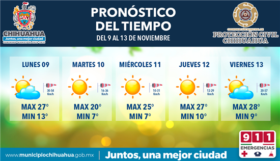El lunes será un día ventoso medio nublado, con temperatura máxima de 27 y mínima de 13 grados centígrados; martes y miércoles se espera que permanezcan mayormente soleados, con temperaturas máximas de 20 y 25 grados, respectivamente y mínimas de 7° C para ambos días; para el jueves se pronostica un día mayormente soleado y el termómetro llegará a los 27 grados y bajará a los 10; el viernes habrá nublados escasos, con vientos de hasta 57 kilómetros por hora y temperaturas respectivas de 28 y 9 grados Celsius.