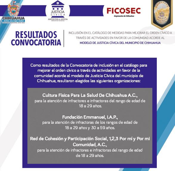 Las personas dictaminadoras integrantes tanto de FICOSEC como de la DSPM de Chihuahua y externos, recibieron las propuestas hasta el 20 de noviembre eligiéndose este 1 de diciembre a tres organizaciones de la sociedad civil que cumplieron con los requisitos y actividades acordes a lo que se estaba buscando, enlistándose a continuación según la temática de atención: