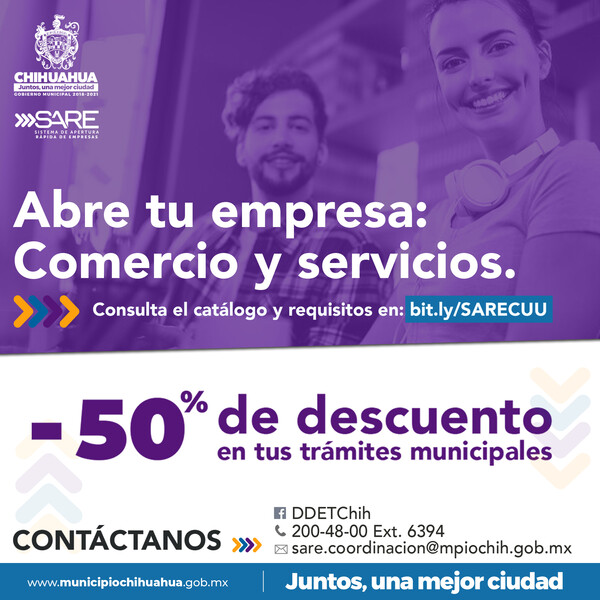Desde el Sistema de Apertura Rápida de Empresas (SARE), se invita a los interesados en aprovechar el descuento a que consulten los pasos en www.bitly.com/SARECUU, o bien se comuniquen al correo electrónico sare.coordinacion@mpiochih.gob.mx y al teléfono 072 extensión 6394.