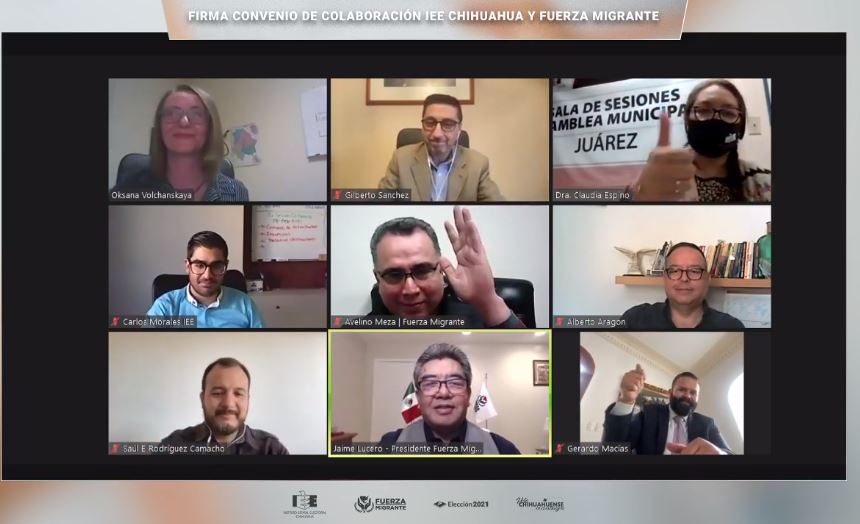 El acto protocolario se realizó de manera virtual, donde Claudia Arlett Espino, consejera presidenta del IEE, y Jaime Lucero Cásares, presidente de Fuerza Migrante, plasmaron sus firmas y como testigos estuvieron Avelino Meza, secretario general binacional de Fuerza Migrante, y Calos Morales Medina, encargado del