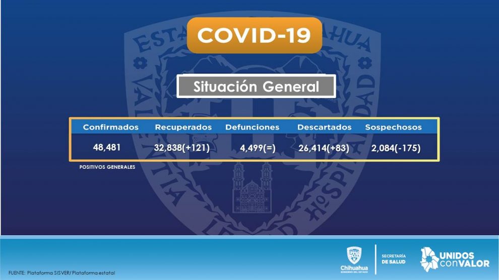 Secretaría de Salud dio a conocer que se tienen en el estado de Chihuahua un total general de 48 mil 481 contagios y 4 mil 499 personas fallecidas, sin que se confirmaran nuevos decesos.