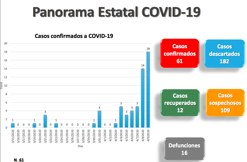 El director médico de la Secretaría de Salud en la Zona Norte, Arturo Valenzuela Zorrilla, dio a conocer que la cifra de defunciones por COVID-19 llegó a 16 en el estado de Chihuahua, mientras que el número de casos confirmados se mantiene en 61.