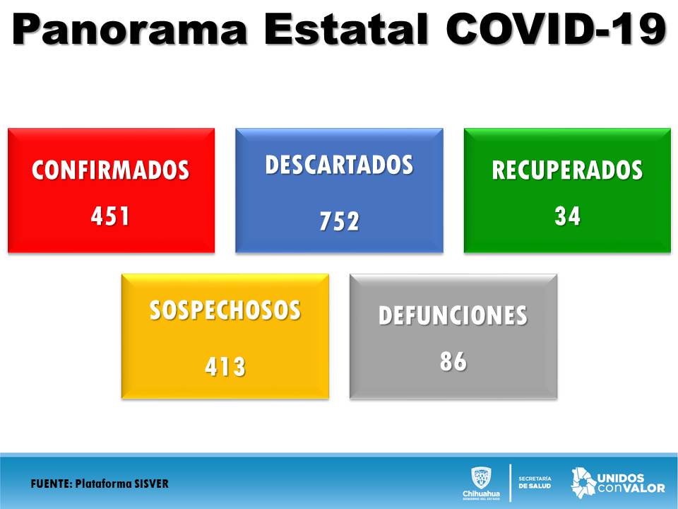 Al día 30 de abril se reportan en Chihuahua un total de 451 casos confirmados de COVID-19, así como 86 fallecimientos, 34 personas recuperadas, 752 descartados tras las pruebas PCR y 413 sospechosos.