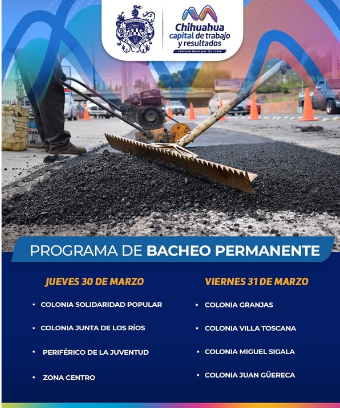 Chihuahua, Chih. A 30 de marzo de 2023.- El Gobierno Municipal de Chihuahua, por medio de la Dirección de Obras Públicas, pide tomar precauciones a los conductores por los trabajos de bacheo que realizarán jueves 30 y viernes 31 de marzo en diferentes avenidas y calles de la ciudad.