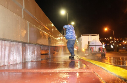 Para esta labor se emplea una cuadrilla de trabajadores que aplican agua a presión en la superficie de los bajo puentes, además de realizar limpieza general en la zona y corte de hierba.
