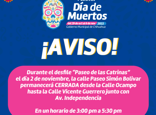 El próximo miércoles 2 de noviembre de 15:00 a 17:30 horas, el Paseo Bolívar, desde la avenida Ocampo y hasta la calle Vicente Guerrero, permanecerá cerrado para dar paso a los contingentes que formarán parte del “Paseo de las Catrinas”, organizado por el Gobierno Municipal, a través del Instituto de Cultura del Municipio con motivo de la celebración de Día de Muertos, por lo que se