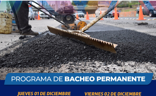 El Gobierno Municipal, por medio de la Dirección de Obras Públicas, exhorta a la población a tomar precauciones por los trabajos de bacheo que se realizarán jueves 1 y viernes 2 de diciembre, en diferentes avenidas, calles y colonias de la ciudad, a fin de evitar contratiempos al momento de circular por las áreas de trabajo.