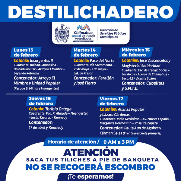 El Gobierno Municipal de Chihuahua, a través de la Dirección de Servicios Públicos Municipales, informa a la ciudadanía el calendario del programa Destilichadero que se realizará del 13 al 18 de febrero, en siete colonias de Chihuahua Capital.