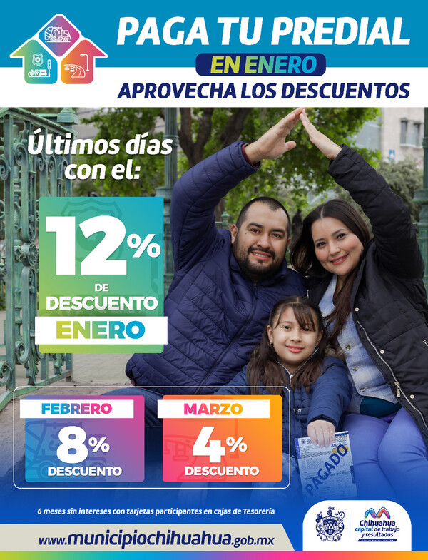 El Gobierno Municipal, a través de la Tesorería, te recuerda que quedan pocos días para aprovechar el descuento del 12 por ciento en el pago del Impuesto Predial, el cual estará vigente hasta el martes 31 de enero y cuyo trámite puedes hacer en línea sin salir de casa.