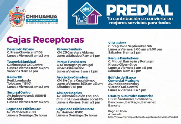 El Gobierno Municipal de Chihuahua pone a disposición de la ciudadanía la ubicación de las diferentes cajas receptoras en las cuales se puede hacer el pago del impuesto predial, así como los horarios de atención de las mismas.