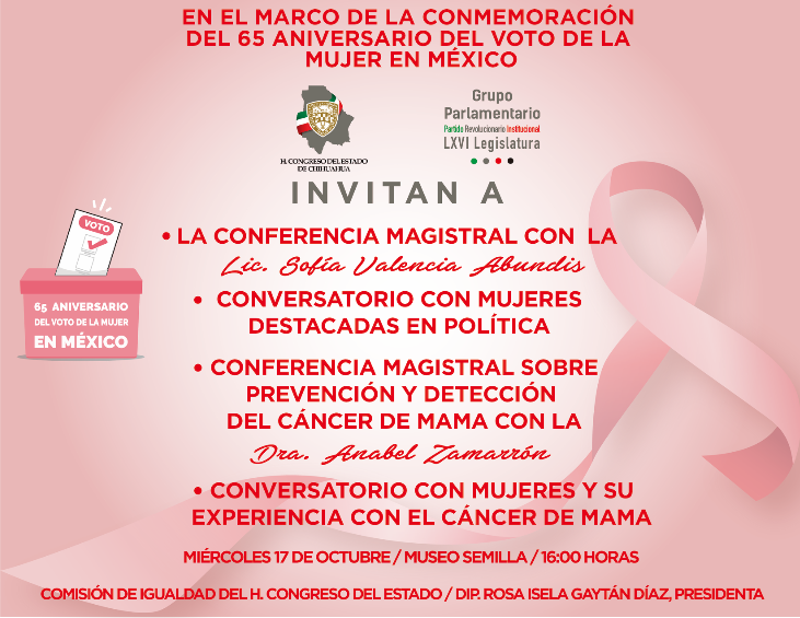 La coordinadora del Grupo Parlamentario del PRI en el Congreso del Estado, Rosa Isela Gaytán Díaz, recordó que el 17 de octubre se conmemora el 65 Aniversario del voto de la mujer, promulgado en el año de 1953 cuando se publicó el Decreto de reformas a los artículos 34 y 115 de la Constitución; que incorporó a las mujeres como ciudadanas mexicanas con plenos derechos.